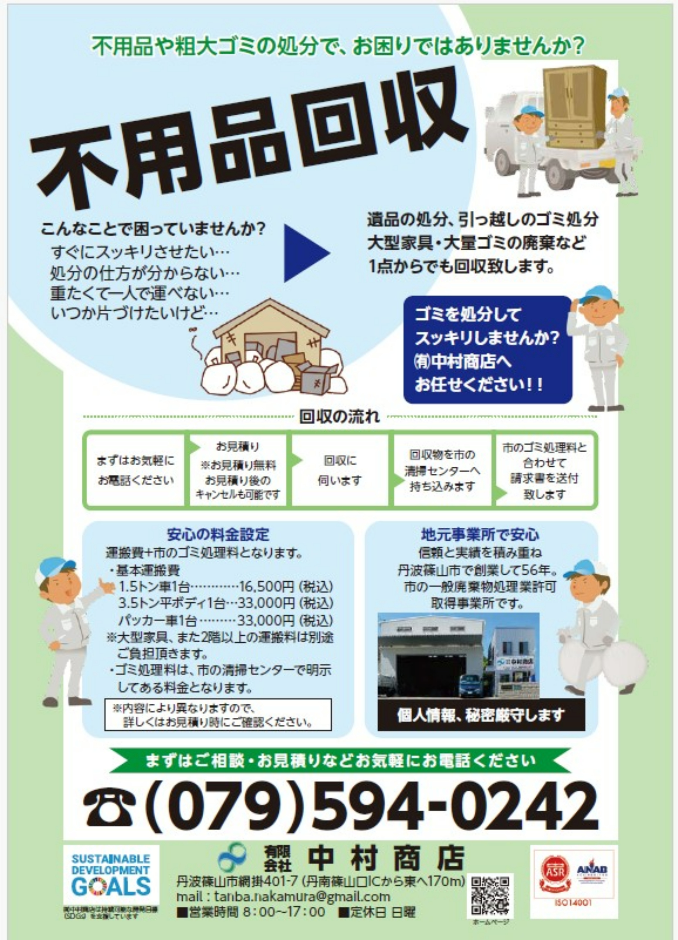 有限会社中村商店 中村相石 1966(昭和41)年5月 2001(平成13)年5月 300万円 〒669-2205 兵庫県丹波篠山市網掛401番地7 Tel/fax 079(594)0242 産業廃棄物収集運搬業、一般廃棄物収集運搬業 資源リサイクル業、不用品回収、家・倉庫の掃除